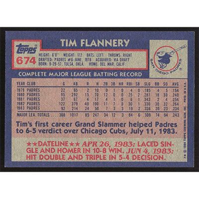 This is a 1984 Topps Tim Flannery baseball card. The card is #674 and pictures show condition.