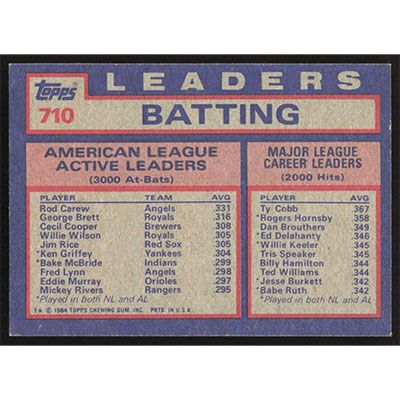 This is a 1984 Topps George Brett, Rod Carew and Cecil Cooper League Leaders baseball card. The card is #710 and pictures show condition. Team(s): Kansas City Royals/California Angels/Milwaukee Brewers