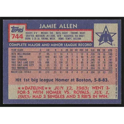This is a 1984 Topps Jamie Allen baseball card. The card is #744 and pictures show condition.