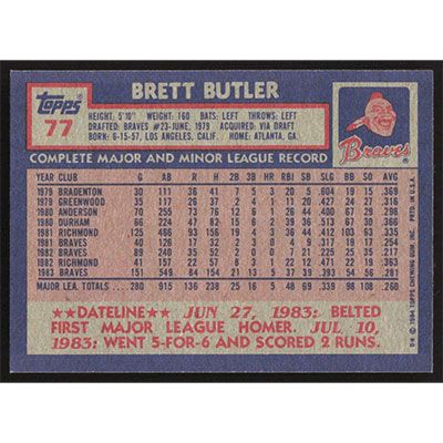 This is a 1984 Topps Brett Butler baseball card. The card is #77 and pictures show condition.