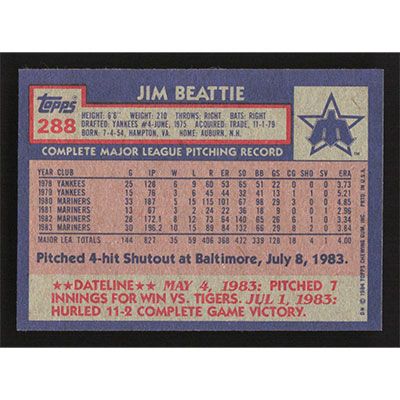 This is a 1984 Topps Nestle Jim Beattie baseball card. The card is #288 and pictures show condition.