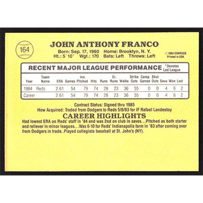 This is a 1985 Donruss John Franco baseball card. The card is #164 and pictures show condition.