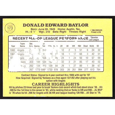 This is a 1985 Donruss Don Baylor baseball card. The card is #173 and pictures show condition.