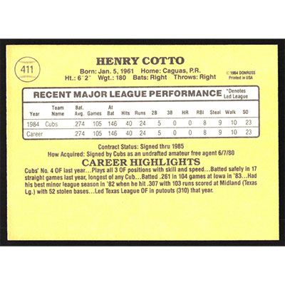 This is a 1985 Donruss Henry Cotto baseball card. The card is #411 and pictures show condition.