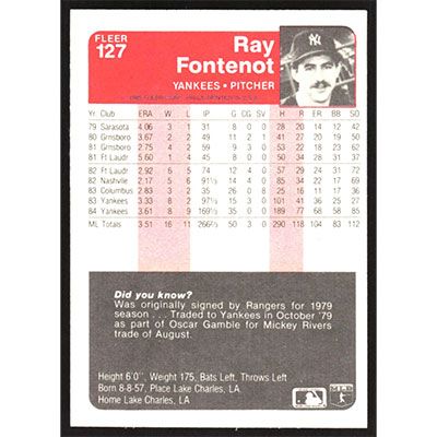 This is a 1985 Fleer Ray Fontenot baseball card. The card is #127 and pictures show condition.