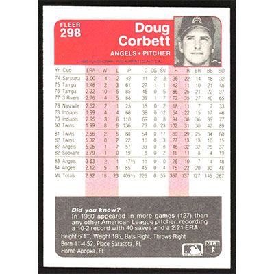 This is a 1985 Fleer Doug Corbett baseball card. The card is #298 and pictures show condition.