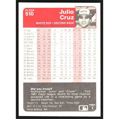 This is a 1985 Fleer Julio Cruz baseball card. The card is #510 and pictures show condition.