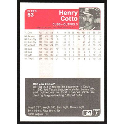 This is a 1985 Fleer Henry Cotto baseball card. The card is #53 and pictures show condition.