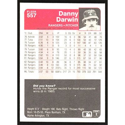 This is a 1985 Fleer Danny Darwin baseball card. The card is #557 and pictures show condition.