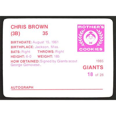 This is a 1985 Mother's Cookies Chris Brown baseball card. The card is #18 and pictures show condition.