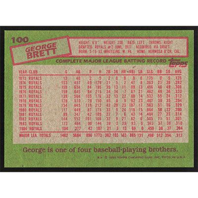 This is a 1985 Topps George Brett baseball card. The card is #100 and pictures show condition.