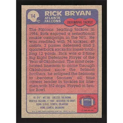 This is a 1985 Topps Rick Bryan football card. The card is #14 and pictures show condition.