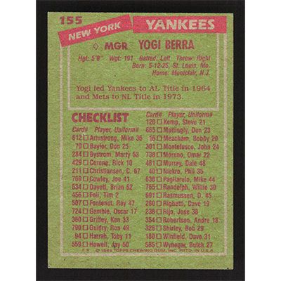 This is a 1985 Topps Yogi Berra Team Checklist baseball card. The card is #155 and pictures show condition.