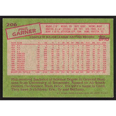 This is a 1985 Topps Phil Garner baseball card. The card is #206 and pictures show condition.