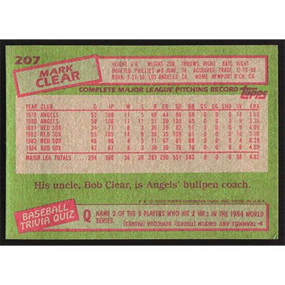 This is a 1985 Topps Mark Clear baseball card. The card is #207 and pictures show condition.