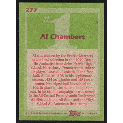 This is a 1985 Topps Al Chambers First Draft Pick baseball card. The card is #277 and pictures show condition.