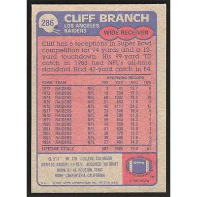 This is a 1985 Topps Cliff Branch football card. The card is #286 and pictures show condition.