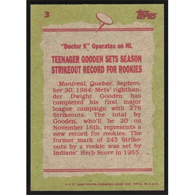 This is a 1985 Topps Dwight Gooden Record Breaker baseball card. The card is #3 and pictures show condition.