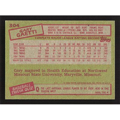 This is a 1985 Topps Gary Gaetti baseball card. The card is #304 and pictures show condition.