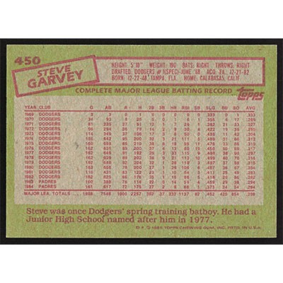 This is a 1985 Topps Steve Garvey baseball card. The card is #450 and pictures show condition.