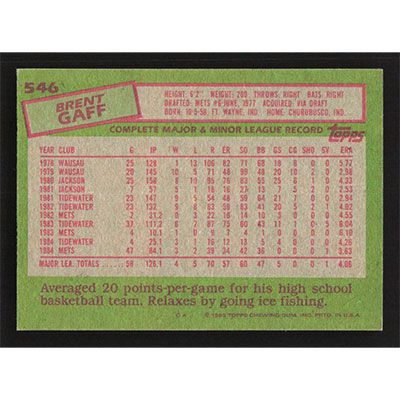 This is a 1985 Topps Brent Gaff baseball card. The card is #546 and pictures show condition.