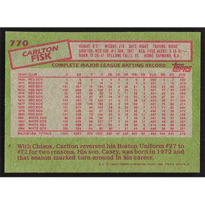 This is a 1985 Topps Carlton Fisk baseball card. The card is #770 and pictures show condition.