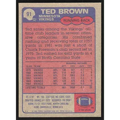 This is a 1985 Topps Ted Brown football card. The card is #91 and pictures show condition.