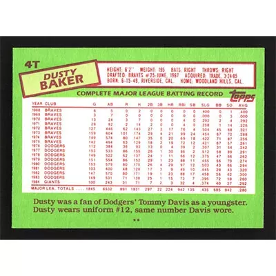 This is a 1985 Topps Traded Dusty Baker baseball card. The card is #4T and pictures show condition.