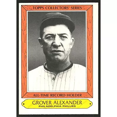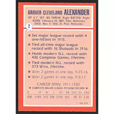 This is a 1985 Topps Woolworth All-Time Record Holders Grover Alexander baseball card. The card is #2 and pictures show condition. Team(s): Philadelphia Phillies