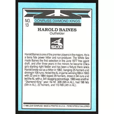 This is a 1986 Donruss Harold Baines Diamond Kings baseball card. The card is #13 and pictures show condition.