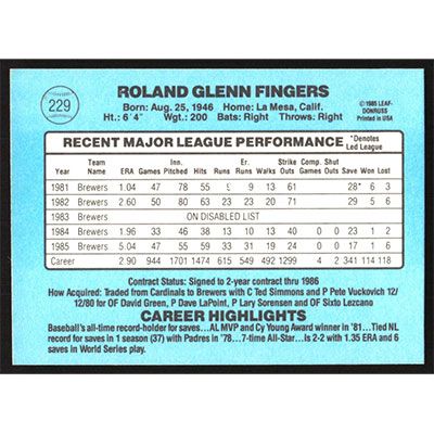 This is a 1986 Donruss Rollie Fingers baseball card. The card is #229 and pictures show condition.