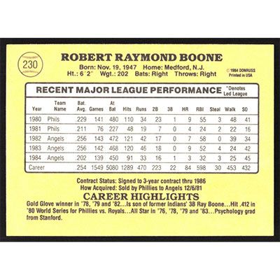 This is a 1986 Donruss Bob Boone baseball card. The card is #230 and pictures show condition.