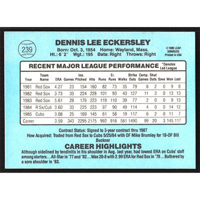 This is a 1986 Donruss Dennis Eckersley baseball card. The card is #239 and pictures show condition.