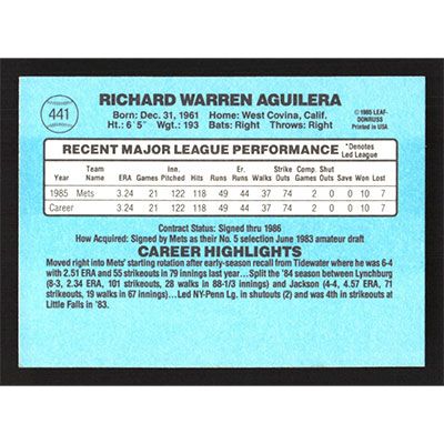 This is a 1986 Donruss Rick Aguilera baseball card. The card is #441 and pictures show condition.
