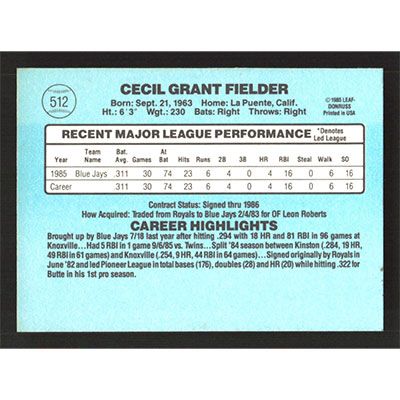 This is a 1986 Donruss Cecil Fielder baseball card. The card is #512 and pictures show condition.