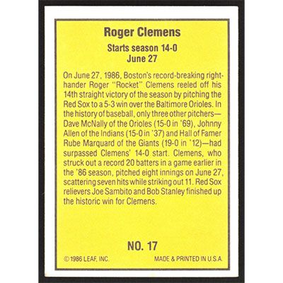 This is a 1986 Donruss Highlights Roger Clemens baseball card. The card is #17 and pictures show condition.