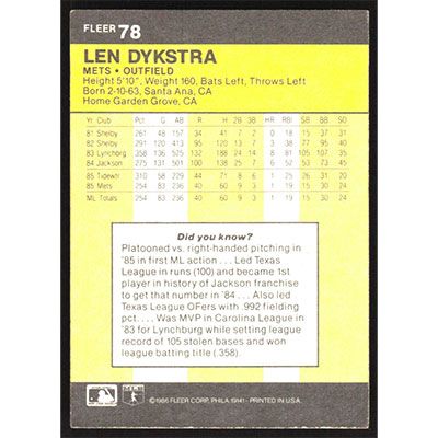 This is a 1986 Fleer Len Dykstra baseball card. The card is #78 and pictures show condition.