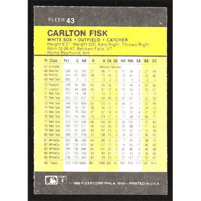 This is a 1986 Fleer Mini Carlton Fisk baseball card. The card is #43 and pictures show condition.