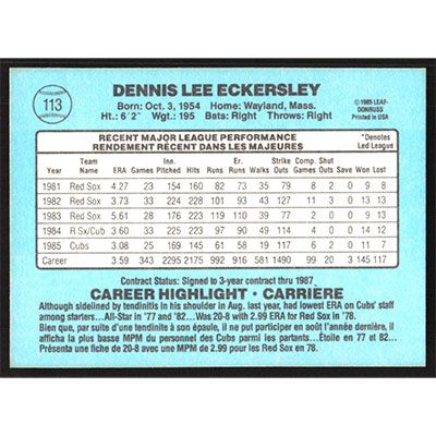 This is a 1986 Leaf Dennis Eckersley baseball card. The card is #113 and pictures show condition.