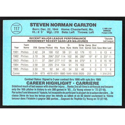 This is a 1986 Leaf Steve Carlton baseball card. The card is #117 and pictures show condition.