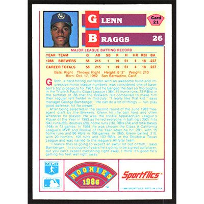 This is a 1986 Sportflics Rookies Glenn Braggs baseball card. The card is #21 and pictures show condition.