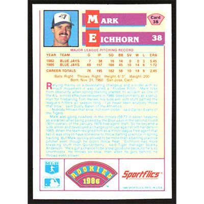 This is a 1986 Sportflics Rookies Mark Eichhorn baseball card. The card is #38 and pictures show condition.