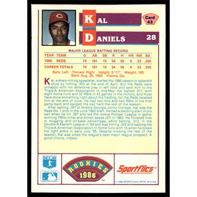 This is a 1986 Sportflics Rookies Kal Daniels baseball card. The card is #43 and pictures show condition.