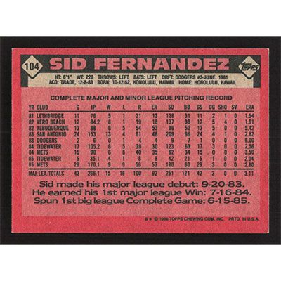 This is a 1986 Topps Sid Fernandez baseball card. The card is #104 and pictures show condition.