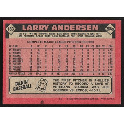 This is a 1986 Topps Larry Andersen baseball card. The card is #183 and pictures show condition.