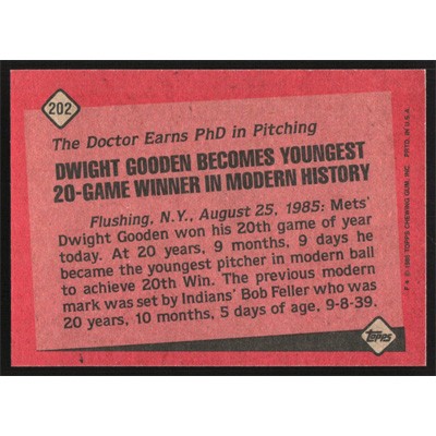 This is a 1986 Topps Dwight Gooden Record Breaker baseball card. The card is #202 and pictures show condition.