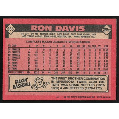 This is a 1986 Topps Ron Davis baseball card. The card is #265 and pictures show condition.
