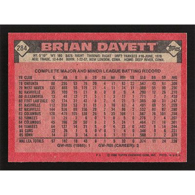 This is a 1986 Topps Brian Dayett baseball card. The card is #284 and pictures show condition.