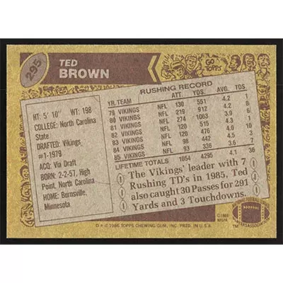 This is a 1986 Topps Ted Brown football card. The card is #295 and pictures show condition.