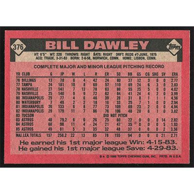 This is a 1986 Topps Bill Dawley baseball card. The card is #376 and pictures show condition.